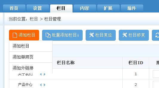 選擇【欄目】,找到【添加欄目】,點擊【添加單網頁】